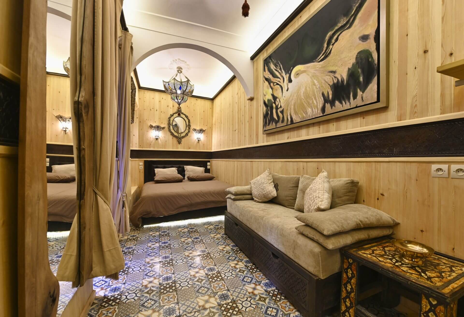 Mit einer hellen Holzverkleidung und viel Beleuchtung ist Al Azraq unser hellstes Zimmer. Im Jahr 2019 wurde es renoviert, und seit dem macht nur noch das Badezimmer dem Namen ehre. Denn Azraq bedeutet Blau